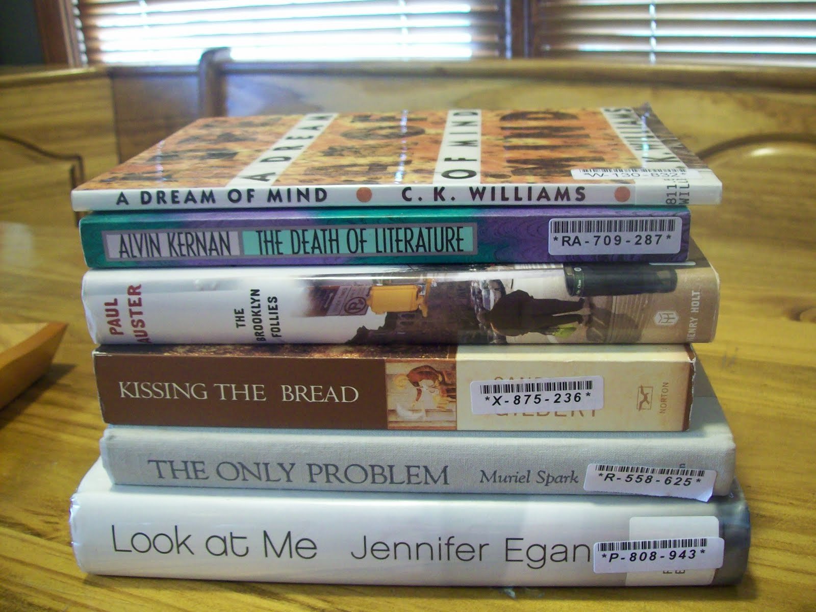 When the package arrived on Saturday, here’s what it contained: Look at Me by Jennifer Egan – I just listened to The Keep on audio and really got into the second half of it and some of the twists, wanted to try another by her; The Only Problem by Muriel Spark, whom I like very much; Kissing the Bread, a large volume of “new and selected poems” by Sandra Gilbert, a well-known literary critic and perhaps lesser-known poet – I got one of her poetry books from the library a year or so ago and was quite impressed; The Death of Literature by Alvin Kernan, one of those criticism titles that had been on my “watch list” for a while; and A Dream of Mind, by a poet I’d like to know better, C. K. Williams.